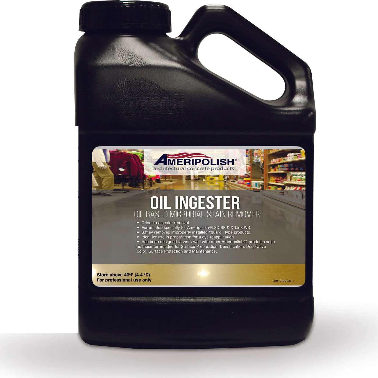 Ameripolish Oil Ingester Concrete Stain Remover is an enzyme-based product that consumes and breaks down oil-based materials and absorbs odors from the surface of the concrete without causing damage or affecting any existing colorant, sealer, or stain protector. The biodegradable product is environmentally safe and can be left on surfaces for several days if needed to deeply penetrate seeped stains.